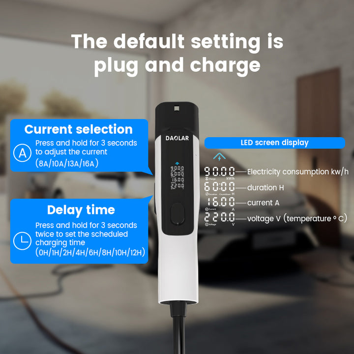 - Recharge programmée de 1 à 12 heures, intelligente et économique : Double-cliquez pendant 3 secondes pour définir une **charge programmée** de 1 à 12 heures. Profitez des tarifs d’électricité hors pointe en Europe ; réveillez-vous avec une voiture entièrement chargée, économisant temps et argent !