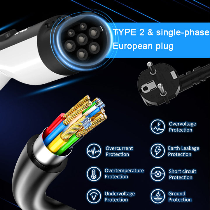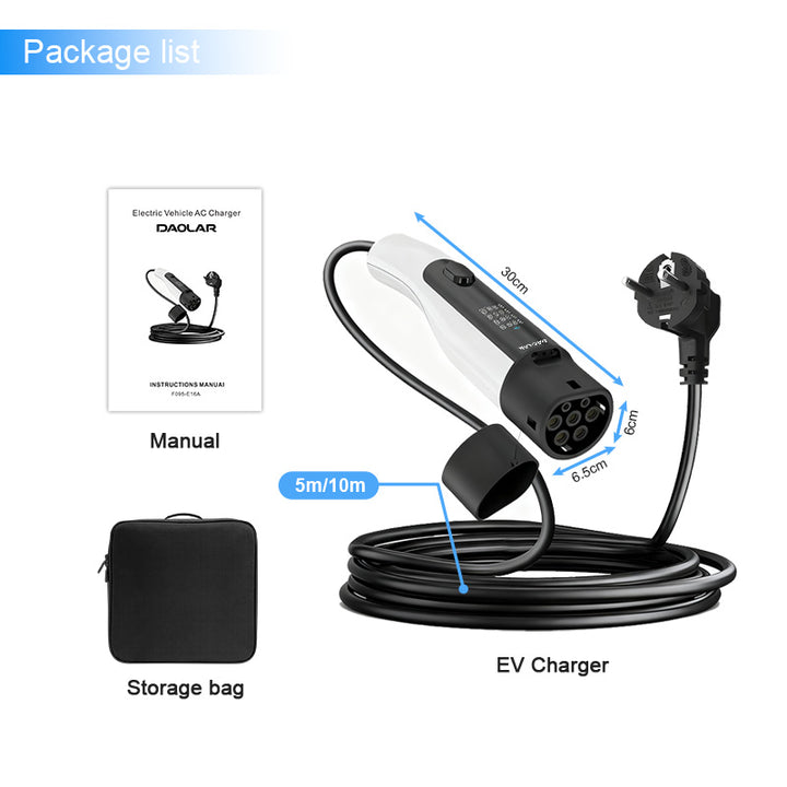 - Dites adieu au volume ! Nous avons révolutionné le design en supprimant le boîtier de contrôle lourd. Le connecteur Type 2 ne pèse que 0,6 kg, et même le **câble de recharge** de 5 mètres ne pèse que 1,8 kg au total. Rangez-le facilement dans votre coffre ou votre sac à dos – un véritable **chargeur VE de poche** !