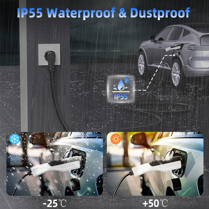 - Étanchéité IP55 contre l’eau et la poussière : Construit avec une coque durable, notre **chargeur VE mobile classé IP55** résiste aux diverses conditions climatiques européennes. Fonctionne parfaitement de -25℃ à 50℃, fiable en tout climat.